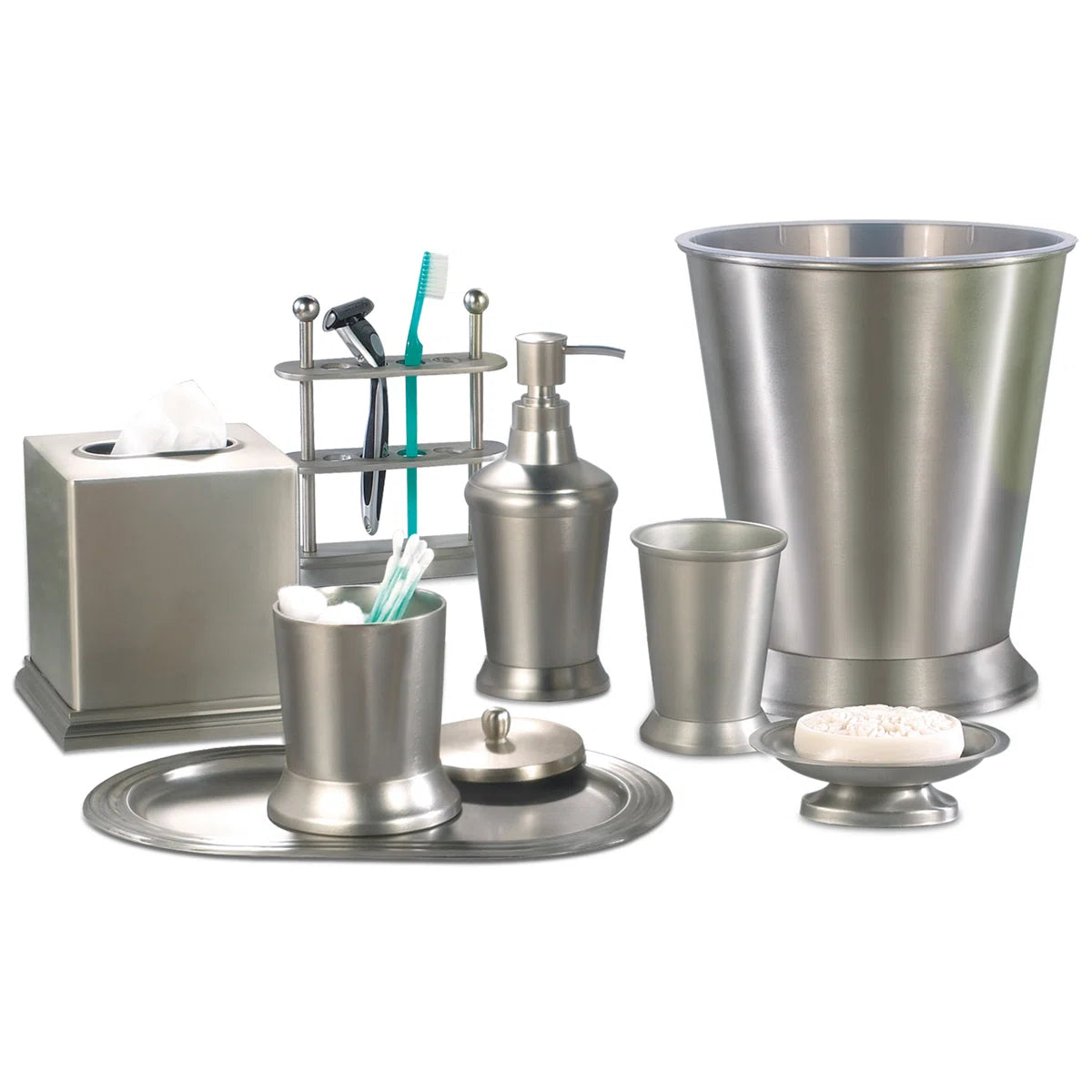 - Complete your luxury bathing experience with our bathroom accessories set! Our 8-piece set includes a soap pump - fill with your favorite liquid soap solution or hand sanitizer; It is easy to refill, just unscrew the top - the wide mouth makes refills easy; The tumbler cup is perfect when you need a drink of water, a rinse after brushing or use it to contain large toothpaste tubes and spin toothbrushes; The divided toothbrush stand has sections to keep toothbrushes secure; The soap dish has ridges to keep water away and extend the life of your soap; a cotton swab holder, a boutique tissue box cover, a wastebasket, and a multipurpose amenity tray or towel tray.